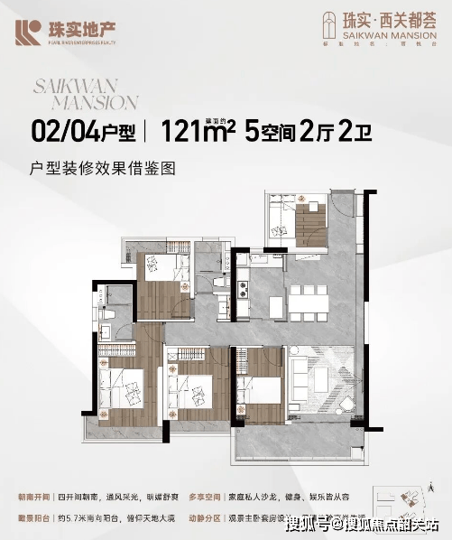 建面约121㎡的4房2厅2卫户型是珠实西关都荟的主推产品,也是市场上最受欢迎的改善型户型之一。这款户型在设计上更加注重舒适度和实用性,每一个细节都经过反复推敲。入户后,紧凑的过道设计避免了面积的浪费,将更多的空间留给了功能区域。客餐厅一体化设计,搭配超宽景阳台,视野开阔,采光通风俱佳。厨房采用半开放式设计,既保持了空间的通透感,又有效隔绝了油烟。四个卧室布局合理,主卧套房设计是本案的一大亮点。主卧不仅面积宽敞,还配备了独立卫生间和衣帽间,保证了主人的私密性和尊贵感。主卧的飘窗设计巧妙,既可以作为休闲区,又可以增加储物空间。